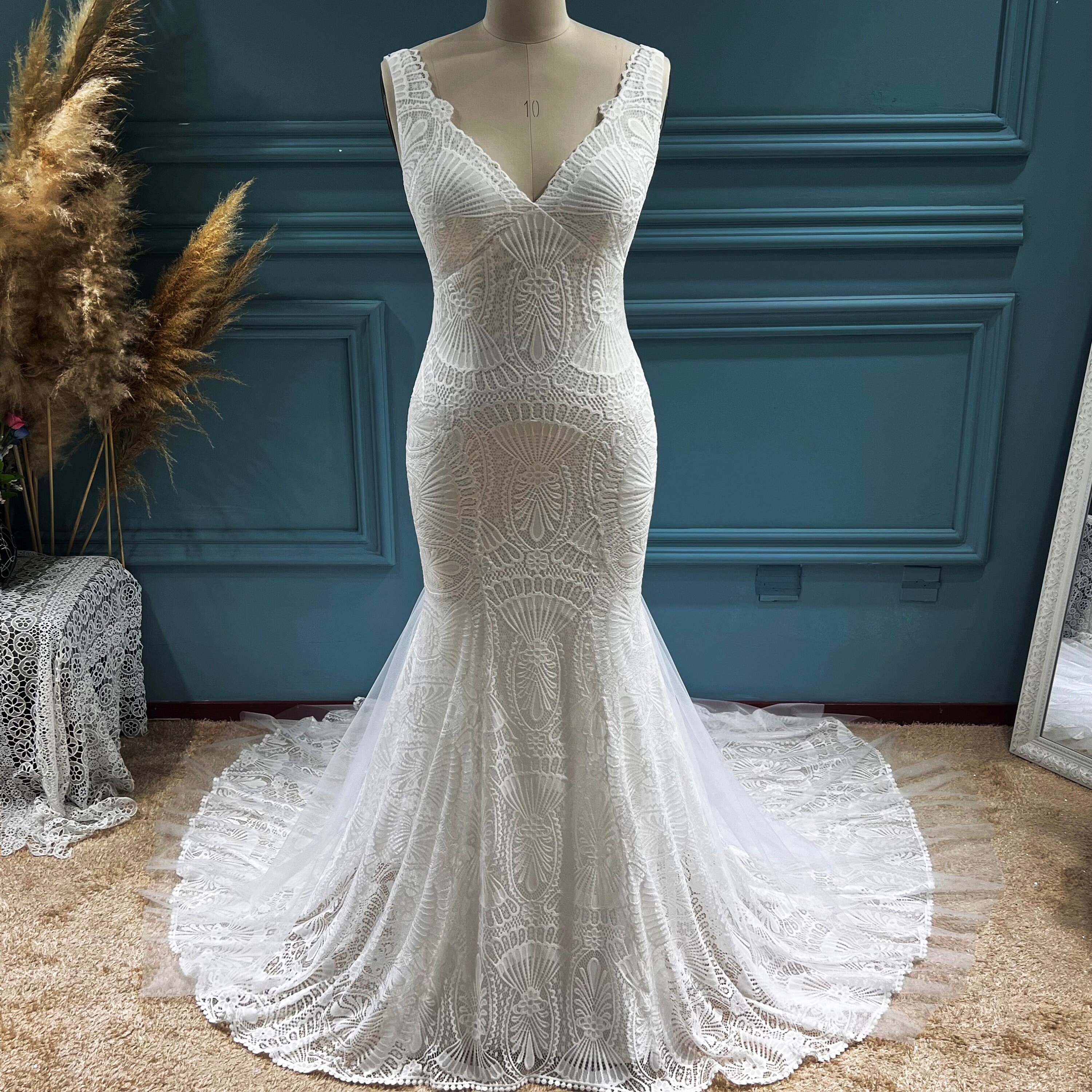 Mermaid Wedding Dress Embroidered Long Sleeves Deap V Neck Elegant Dress Romantic Dress Wedding Dress Tulle Boho Bridal Gown Etsy Finland